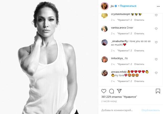 В 51 год она выглядит заметно моложе своего возраста и танцует не хуже молодых профессиональных танцовщиц. Эффектная шатенка в этот раз показала себя в естественном виде и без лишних украшений. На черно-белом фото она позировала в одной белой майке без рукавов. Примечательно то, что также Лопес засветила грудь, ведь не надела лифчик. Небольшая пикантность привлекла внимание сразу же к себе. Вот что пишут в сети: «Я влюблен и покорен; оmgg, она просто нереальная женщина с чувством стиля; Богини не могут быть плохими