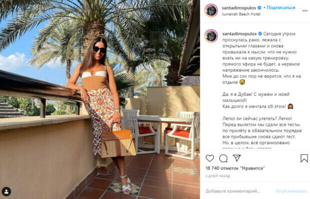 После того, как многие артистки завершили перед новым годом работу над проектами, альбомами и отсняли последние выпуски шоу, они отправились на жаркий отпуск Чтобы собраться с силами и отдохнуть перед началом нового года, звезды предпочитают отправляться за границу и отдыхать. Представляем вашему вниманию топ-подборку фото звезд, отправившихся недавно в отпуск, некоторые поклонники смогли сразу выбрать победителя в лучшем образе для отдыха: Санта Димопулос после оглушительной и скандальной победе на проекте «Танцы со звездами» улетела отдыхать с ребенком и мужем в Дубаи: «Сегодня утром проснулась рано, лежала с открытыми глазами и снова привыкала к мысли, что не нужно ехать ни на какую тренировку, прямого эфира не будет, а нервное напряжение закончилось.