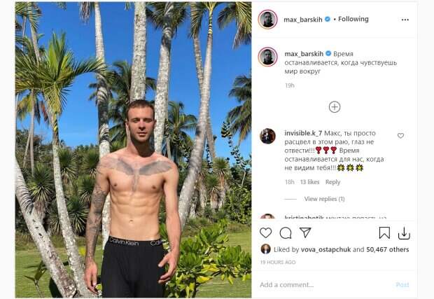 Популярный певец Макс Барских сверкнул обнаженным телом на экзотическом курорте и взбудоражил фанатов Как передает Politeka.net, артист выложил откровенное фото на своей странице в "Инснтаграм", отдыхая в тропической стране. Красавец позировал под высокими пальмами с голым татуированным торсом одетый то ли в трусы, то ли в тонкие штаны на резинке.