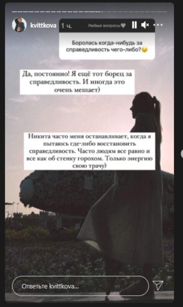 Победительница "Холостяк-9" Даша Квиткова, ставшая женой Никиты Добрынина, разоткровенничалась в Сети Как передает Politeka.net, 22-летняя девушка, которая ждет своего первенца, опубликовала свежие "сториз" у себя в Инстаграм, ответив на актуальные вопросы от подписчиков. В частности, у Квитковой поинтересовались, боролась ли она когда-нибудь за справделивость чего-либо.