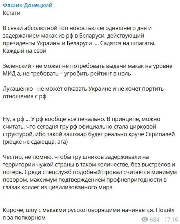 Он отметил, что задержание российских боевиков происходило без открытия огня и без каких-либо потерь. "Честно, не помню, чтобы ГРУшников задерживали на территории чужой страны в таком количестве, без выстрелов и потерь. Среди спецслужб подобный провал считается минимум позором, максимум - подтверждением профнепригодность в глазах коллег из цивилизованного мира", - уверен блогер. Кроме того, на фоне резонансного задержания российских боевиков в Беларуси он предсказывал довольно непростые времена как Лукашенко, так и Зеленскому. "В связи с абсолютной топ-новостью сегодняшнего дня и задержанием макак из РФ в Беларуси, действующий президенты Украины и Беларуси... Садятся на шпагаты. Каждый на свой", - написал блогер. Он объяснил это тем, что теперь Зеленский не сможет не требовать на уровне МИД выдачи боевиков, которые принимали участие в боевых действиях на Донбассе на стороне "ЛДНР", потому что требовать - "угробить рейтинг в ноль". Лукашенко тем временем, по прогнозам блогера, не может отказать Украине, однако и не хочет портить отношения с РФ. Напомним, в Беларусь завезли из РФ более двух сотен боевиков, кадры: "Приехали с целью...". Также Politeka писала, что в Украине хотят выдачи задержанных в Минске боевиков РФ: "Если воевали на Донбассе, нужно. ..". Как ранее сообщала Politeka, Лукашенко после украинских санкций заявил об интеграции с Россией: "Друг познается в беде".