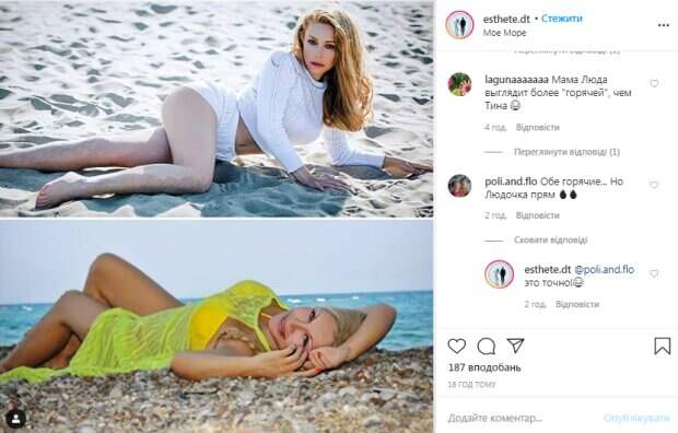 Она элегантно лежала на песку, оголив свои аппетитные бедра. Людмила Балан тоже лежала на песке. Она улеглась на спину, засветив стройные ножки. Женщина смотрела в кадр и улыбалась. «Две музы, две моих Мадонны. Белоснежный песчаный или знойный галичный?! - ну даже и не знаю, что мне ближе...», - подписано фото. В комментариях фанаты стали обсуждать, кто из женщин на фото выглядит лучше. «Для многих Муза - это ветренная девушка. Она влюбляется в одного, завладев сердцем, тут же бросает его ради другого. Но быть настоящей Музой не так просто… Настоящая Муза - очень терпелива и сдержанна», «Мама Люда выглядит более "горячей", чем Тина», «Обе горячие... Но Людочка прям огонь», - пишут пользователи сети. Отметим, что Тина и Дан долгое время притворялись, что между ними что-то есть. Но после окончания шоу новостей об их романе стало все меньше. Напомним, что Тина Кароль после слухов о беременности показала трогательное фото с сыном: "Пример семьи". А еще Politeka писала, что знойная Кароль в одном лишь свитере похвасталась стройными ножками: "Поджарила всех этим видом". Также Politeka сообщала, что подружка Тины Кароль Юлия Санина взбудоражила поклонников "Танців з зірками", видео: "Я готова. ..".