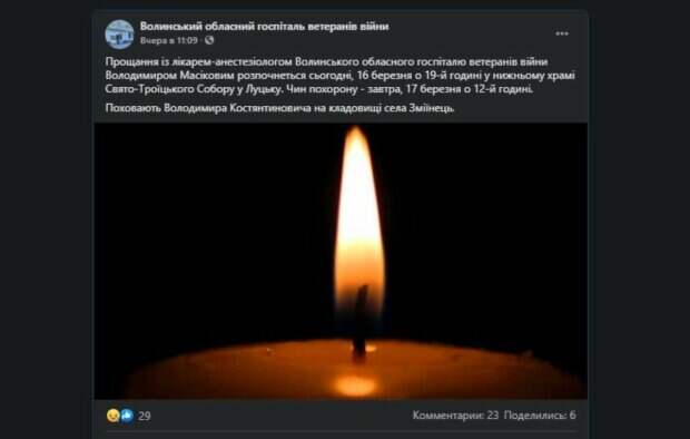 Оборвалась жизнь врача-анестезиолога Волынского областного госпиталя ветеранов войны Владимир Масикова Как передает Politeka.net, об этом сообщили на Facebook-страничке медучреждения. "Прощание с врачом-анестезиологом Волынского областного госпиталя ветеранов войны Владимиром Масиковим начнется сегодня, 16 марта в 19 часов в нижнем храме Свято-Троицкого Собора в Луцке.