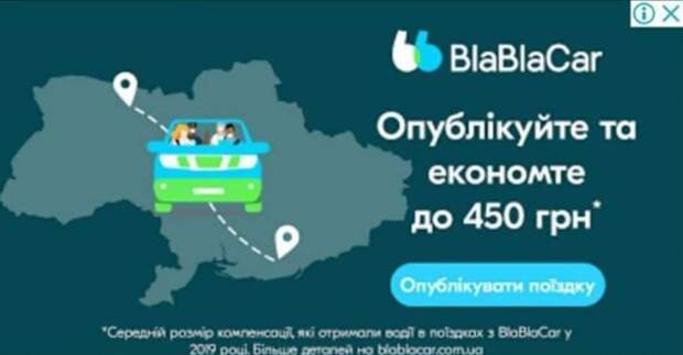 В сервисе BlaBlaCar опубликовали рекламное изображение карты Украины без Крыма. Об этом сообщил Александр Остапа на своей Facebook-странице. "А это OK такую рекламу в гугле получать? BlaBlaCar, а чей Крым?" - написал Александр и прикрепил изображение рекламы компании без Крыма. В компании ему ответили, что это ошибка и в компании сейчас выясняют, как могла появиться подобная реклама.