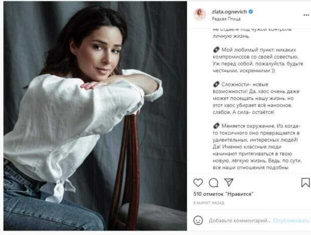 Поэтому большинство ее фото и постов относятся только к нейтральным темам без намека на отношения или влюбленность. В этот раз Злата представила 8 признаков того, что Вы идёте в нужном направлении. «Вам абсолютно безразлично мнение окружающих. Основной ориентир- внутренние ощущения,- как степень наивысшей свободы. Мой любимый пункт: никаких компромиссов со своей совестью. Сложности- новые возможности! Меняется окружение. Из когда-то токсичного оно превращается в удивительных, интересных людей! События начинают легко приходить в нашу жизнь, появляется много энергии и ощущение полёта. Всё в Вас настолько пребывает в состоянии баланса, что очень сложно нарушить равновесие и выйти из себя. Щедрость. Духовная и материальная. Состояние, когда хочется отдавать и радовать других! К Вам приходит здоровье. Все знают, что любая болезнь связана с ментальным состоянием, и его улучшение напрямую влияет на физическое состояние. И главное. Путь- это процесс, а не конечный результат. Потому что в процессе всегда появляется новый путь» - написала исполнительница под стильным кадром. В сети поддержали: «Очень сильно и душевно