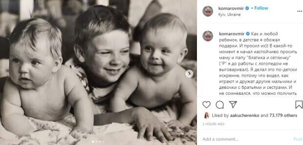 "Как и любой ребенок, в детстве я обожал подарки. И просил их)) В какой-то момент я начал настойчиво просить маму и папу "блатика и сетличку" ("Р" я до работы с логопедом не выговаривал)", - пишет телеведущий. - "Когда мне исполнилось 6, моя мечта сбылась. Мама родила. Сначала сестричку. Через 10 минут - братика. Удивлены были все, кроме меня: я же просил братика и сестричку". Дмитрий Комаров признался, что ждал из роддома уже взрослых брата и сестру, а потому поначалу расстроился. Однако вскоре он научился ухаживать за детишками, названными в честь бабушки и дедушки: купать, укладывать спать, выгуливать. Сейчас Дима очень благодарен родителям за такой подарок и считает брата с сестрой своими лучшими друзьями. Они до сих пор хорошо общаются и обсуждают жизненные проблемы. Дмитрий Комаров поздравил родственников, которым сегодня исполнился 31 год: "Я где-то очень далеко. Но мы всегда вместе, даже на расстоянии. С днем рождения, дорогие @komarova_angelina и @kol_yan Спасибо за "подарок", дорогие родители". Напомним, Комаров из "Мир наизнанку" ошеломил признанием об отношениях с красавицей-женой: "Подумать не мог, что..." Как сообщала Politeka, роскошная жена Комарова из «Мир наизнанку» показала то, что обычно прячет. Также Politeka писала, что жена Комарова из «Мир наизнанку» ошарашила сходством с Анджелиной Джоли в роскошном образе.