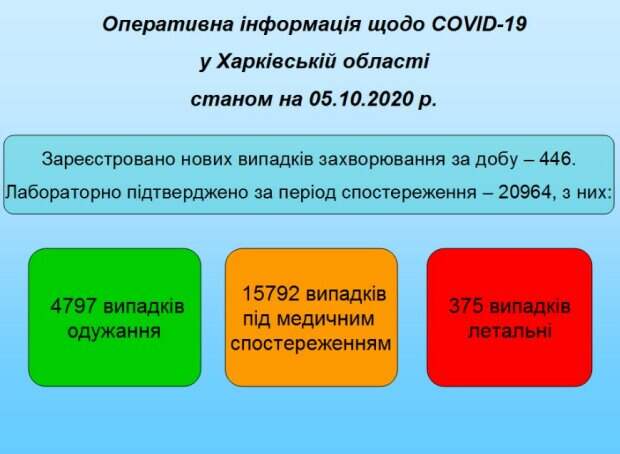 Харьковская область уверенно держится в тройке лидеров по количеству заболевших китайским вирусом За последние сутки в регионе выявлено 446 новых случаев заражения, из которых 284 – в Харькове, передает Politeka.net со ссылкой на информацию Харьковского лабораторного центра. Всего с начала пандемии на Харьковщине зафиксировано 20964 случаев заражения.