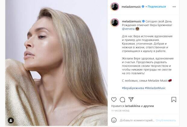 net. На страничке Меладзе появилось трогательное поздравление Веры Брежневой с праздником, которое он сопроводил красивым снимком супруги. На фото Вера Брежнева чувственно смотрит в сторону, акцентируя внимание на идеальной коже и безупречном макияже. Ведущим цветом стал платиновый оттенок, которым были подчеркнуты веки певицы, а также ее наряд. В своем поздравлении Константин Меладзе написал приятные слова о красоте и утонченности певицы. Он пожелал ей вдохновения и счастья. "Для нас Вера источник вдохновения и пример для подражания. Красивая, утонченная. Добрая и нежная в жизни, ответственная и стремящаяся к идеалу в работе. Желаем Вере здоровья, вдохновения и счастья. Продолжать радовать поклонников своим творчеством и чтобы никакие преграды не смогли на это повлиять!",- говорится в пожелании. Но поклонники Брежневой и Меладзе восприняли поздравление не очень позитивно, отметив, что слова - слишком сухие и больше подходят для друга, чем для любимой женщины. "А где любимая женщина, жена", "Как-то суховато прям... и вообще когда вы вместе, словно некомфортно себя чувствуете рядом с Верой", "Он должен делать все это на публику? Он скажет ей красивые и любимые слова лично", "Согласна, ни разу не увидела слова моя любимая женщина. ..", "Пишет как хороший друг",- написали фолловеры в комментариях. Но в защиту Константина также появились и комментарии, объясняющие манеру поздравления. В них утверждалось, что страницу в соцсети Константин не ведет лично и, скорее всего, поздравит любимую женщину не в Instagram. "Страницу Константин не ведёт, почитайте в актуальном ответы на вопросы. Поздравит лично, так что не волнуйтесь вы так. Лично и горячо",- пишут пользователи. Напомним, Брежнева похвасталась любимым развлечением с Меладзе, удивив внешностью: "Разницы в возрасте не заметно" Как сообщала Politeka, подросшие дочери Веры Брежневой изумили внешностью: "Одна из них на вас похожа, другая..." Также Politeka писала, как Кароль, Каменских, Брежнева и другие стильные звезды одевались до популярности: неловкие фото