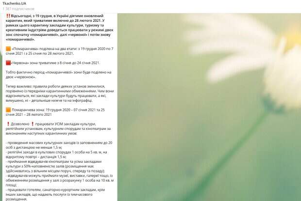 В этот период украинцам придется поочередно жить по двум спискам ограничений. "В рамках этого карантина учреждениям культуры, туризма и креативным индустриям придется работать в режиме двух зон: сначала «оранжевой», далее «красной» и затем снова «оранжевой»", - объяснил министр. - "То есть фактически период «оранжевой» зоны будет разделен надвое «красной»". Первый этап "оранжевого" уровня начинается с 19 декабря и продлится до 7 января 2021 года, в это время смогут работать все культурные и религиозные учреждения, включая кинотеатры, но при таких условиях: на мероприятиях могут находиться не более 20 человек с дистанцией от 1,5 метра и больше; в религиозных сооружениях размещать не более одного человека на пять квадратных метров, а на открытом воздухе соблюдать безопасную дистанцию; в залах кинотеатров и других учреждений культуры можно заполнять не более 50% мест с пустыми креслами не только по бокам, но и спереди-сзади; музеи, выставки и тому подобные могут пускать только по одному человеку на 10 квадратных метров. Сразу после православного Рождества, 8 по 24 января следующего года, начнется ужесточение и тотальный локдаун, во время которого будут действовать правила "красной". В эти дни запрещаются любые массовые мероприятия и посещения культурных учреждений, а разрешается следующее: работа историко-культурных заповедников; репетиции в театрах концертных залах, но без зрителей; открывать рестораны и кафе при гостиницах с 6 до 11 часов утра, доставлять еду в номера; работа горнолыжных курортов, но без заведений общественного питания и баров; проведение утреников и праздничных мероприятий без ярмарок или концертов. Напомним, что украинцы раскрыли, за какие зарплаты готовы работать, где ждут больше всего денег: «средний размер…». Как сообщала Politeka, вирус нанес очередной удар по харьковчанам, десятки тысяч зараженных: новая сводка. Также Politeka писала, что Минздрав обновил список "красной" зоны, ситуация резко ухудшилась: "Украинцам придется идти на...".