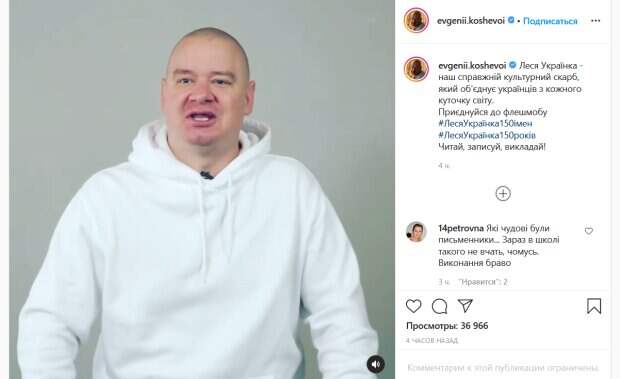 Среди них оказался и Кошевой. Так, на новом видео юморист с выражением прочитал одно из самых известных стихотворений поэтессы - Contra spem spero! (Без надії сподіваюсь!). Кошевой явно старался передать настроение произведения. «Леся Украинка - наше настоящее культурное сокровище, которое объединяет украинцев из каждого уголка мира. Присоединяйся к флешмобу. Читай, пиши, выкладывай!», - написал артист в подписи к видео. Впрочем, не все его поклонники оценили пост Кошевого. Так, в комментариях люди заметили, что артист на видео читает не произносит строчки по памяти, а читает текст с телесуфлера. Многие остались этим недовольны. Однако, немало комментаторов похвалили комика за этот пост. «Жека, ты красава!!», «Ну, всё прекрасно, но если честно лучше б выучил стих а, не читал его с телесуфлера...Ну раз уже так серьезно», «Читать все умеют)) а выучить?», «Какие красивые слова писала наша Леся Украинка», «Женя - молодец, душевненько и от сердца», «Женя, это не твоё, колпак больше подходит, шут ты не плохой», «Я тоже снимала такое с листочками за кадром», - пишут люди. Напомним, Кравец из "Квартал 95" дерзко бросила вызов Кошевому, покорив ярким выступлением: "До встречи на...". Как сообщала Politeka, жена Евгения Кошевого раскрыла детали трагедии, навсегда изменившей ее жизнь: "Убили в подъезде. ..". Также Politeka писала, что Кошевой из "Квартал 95" ошарашил опасными развлечениями с известным украинцем: "Утопиться в слезах...".