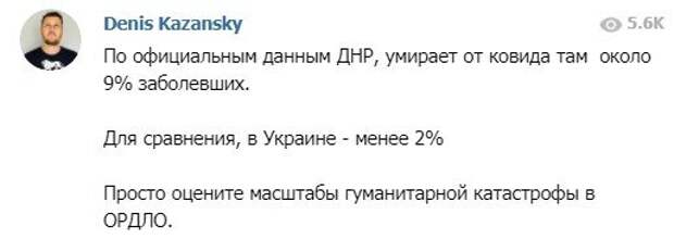 В ОРДЛО от китайского вируса умирают около девяти процентов заболевших, в то время как в Украине этот показатель – меньше двух процентов Такие шокирующие данные привел в своем телеграмм-канале известный донецкий блогер и журналист Денис Казанский, передает Politeka.net. Говоря о статистике смертности, он ссылается на официальные данные «ДНР».