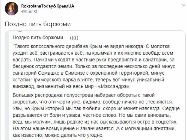 По ее словам, крымчане, желая жить в "родной гавани", содействуя российской оккупации полуострова, впустили, образно говоря, волков в отару или лис в курятник. Она также написала, что известные своей алчностью и пренебрежением закона российские бизнесмены быстро возвратили полуостров в "лихие девяностые". Ведь они отжимают у крымчан все, что только можно: недвижимость, предприятия и малые бизнесы. Крымчанка также привела примеры, за несколько недель к российским бизнесменам в руки перешли санаторий "Семашко" в Симеизе, остатки Приморского парка в Ялте и уникальный винзавод "Массандра". "Большая распродажа полуострова набирает обороты с такой скоростью, что эти черти уже, видимо, вообще ничего не стесняются. Увы, но Крым, который мы так любили, скоро исчезнет навсегда", - пишет крымчанка. Ко всему прочему она добавила, что бизнес между собой делят российские богачи, причем скупают предприятия за бесценок. Скупка по непрозрачным схемам и рейдерские захваты всей хотя бы относительно привлекательной собственности - таково поведение российского бизнеса в оккупированном Крыму. Напомним, местные жители бегут из оккупированного Крыма из-за массовых проблем. Как сообщала Politeka, крымчане пожаловались на отвратительную медицину. Также Politeka писала, что оккупанты в Крыму слили опасные отходы в море, никому нет дела: кричащие кадры.