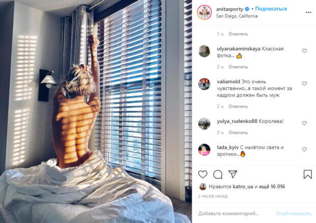 Спортсменка и профессиональный тренер Анита Луценко заставила публику завидовать пикантным фото Как передает Politeka.net, 36-летняя звезда шоу «Зважені та щасливі» опубликовала свежий снимок в своем микроблоге в Инстаграм, на котором показала идеальное утро. Спортсменка позировала в постели, будучи абсолютно голой.