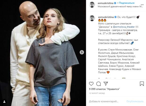 32-летняя российская актриса Кристина Асмус ошарашила необычной сменой амплуа Как передает Politeka.net, звезда опубликовала в своем микроблоге в Инстаграм свежие фото, на которых предстала во время репетиции к спектаклю. Девушка, судя по кадрам, якобы стала жертвой насилия: в частности, ее коллега, играющий роль деспота, запустил свои руки к ней под футболку, а также схватил за горло.