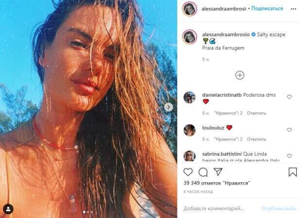 Ненакрашенная, слегка взлохмаченная и мокрая Алессандра козырнула естественной красотой, сняв себя сблизка. Девушка соблазнила оголенными плечиками: судя по тоненьким оранжевым лямкам модель была в бикини. Также ее "дикий" тропический образ дополнило нежное ожерелье из веревочек и камушков. "Соленое бегство