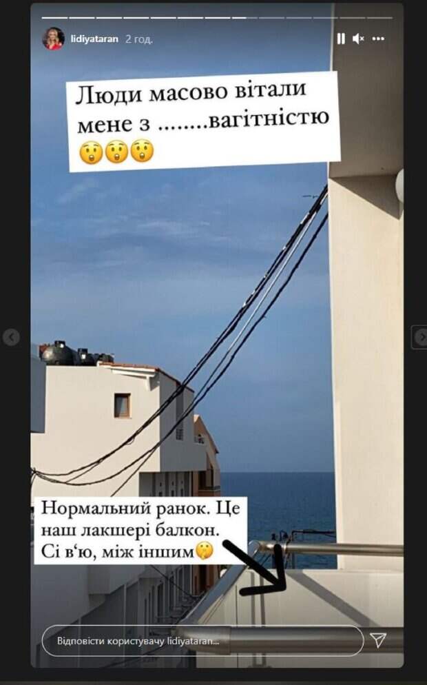 Сейчас Лидия вместе с дочерью-подростком Василиной, которая 5 октября отпраздновала 14-летие, отправились на отдых в солнечную Грецию. Таран активно ведет Инстаграм и там показывает, как проводит с дочерью время на курорте. На новых кадрах Таран решила показать балкон отеля, где остановилась. "Нормальное утро, это наш лакшери-балкон, си вью, между прочим", - написала Лидия. Также Лидия отметила, что ей начали поступать поздравления: "Люди массово поздравляли меня с... беременностью". Звезда также добавила скрин статьи в одном из украинских изданий. Там был следующий заголовок: "Беременная Лидия Таран честно показала округлившийся живот: пришлось выехать из страны, чтобы сбежать от папарацци". На фото Лидия была в купальнике, а рядом стояла дочь Василина. Напомним, красотка из "1+1" Лидия Таран впечатлила количеством денег, которые потратила на увлечение дочери Также Politeka сообщала, что красотка из 1+1 Лидия Таран показала изьян на лице и откровенно призналась, откуда он взялся А еще Politeka писала, что красотка из 1+1 Лидия Таран приехала как можно ближе к Луганску и подняла символ Украины
