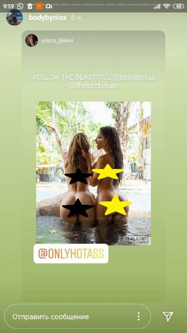 Звезда позировала стоя в воде с такой же голой подружкой-блондинкой. Обе позировала к камере спиной, демонстрируя свои роскошные упругие ягодицы. Да, стать обладательницами таких пятых точек мечтает чуть ли не каждая женщина. Кроме того, тела девушек сияли, то ли от обработки фотошопом, то ли от лосьона. В любом случае выглядели они просто невероятно. Прекрасные модели распустили волнистые от влаги волосы. Дерзкая брюнетка Николь Амато повернулась к подружке, схватила ее за волосы и приоткрыла губы. Фото получилось невероятно жарким, благодаря позам и обнаженным телам. К сожалению, кадр не собрал лайков, ведь в сториз нет такой возможности. Напомним, Николь Амато появилась на видео в белых трусиках-бикини из сетчатой ткани, которая едва ли что-то скрывала, да этого модель и не хотела. Талию подчеркнул белый поясок, а под пятой точкой, на ногах - подвязки. Звезда не спеша шла, когда ее ягодицы снимали крупным планом. Ранее сообщалось, что Николь Амато позировала в красивом белье с кружевом и сеточкой, которое подчеркнуло ее соблазнительные формы. Фитнес-модель держала в руках пистолет, который страстно облизывала языком. «Иногда тебе просто нужно лизать это», - подписала фото звезда. Напомним, что Николь Амато устроила горячую тренировку в мини-топе: "Сейчас выпрыгнут". Как сообщала Politeka, Николь Амато покорила красотой форм в прозрачном топике: "Шикарней некуда". Также Politeka писала, что Николь Амато сверкнула самыми сокровенными местами в белой сеточке: "Королева соблазна".