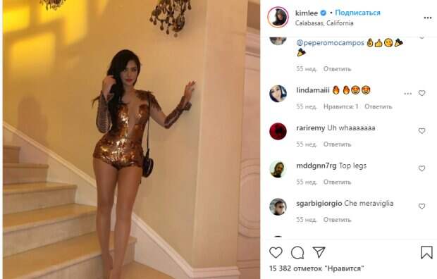 На одном из личных фото Ким появилась в тонком, почти прозрачном золотом комбинезоне с глубоким декольте, прозрачными выставками из сеточки и нашивками на плечах и рукавах. Такой образ не оставил фанатов равнодушными, ведь модель практически не скрыла свою бюст, даже выставив его напоказ. «Я прихожу на ужин как; Хорошенькая! ..