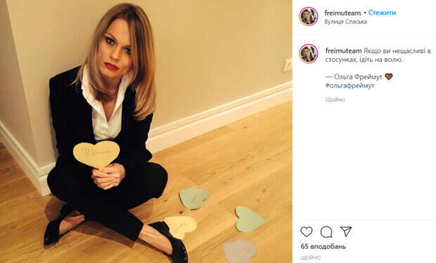 Красотка выбрала сердечко с подписью «Счастье» и продемонстрировала его на камеру. Фреймут была одета в черный брючный костюм, под которым красовалась белоснежная рубашка с декольте. На ногах ведущей были туфли черного цвета. Необычный цвет волос прекрасно гармонировал с ярким макияжем звезды. Стоит отметить, что сейчас Фреймут отдает предпочтение более сдержанному макияжу. В целом образ телеведущей выглядел немного дерзко и грустно. «Если вы несчастливы в отношениях, идите на свободу, - Ольга Фреймут», - подписали фото авторы аккаунта. Ранее мы писали, что Ольга Фреймут поделилась кадрами, сделанными во время ее визита на тренировку сборной Украины по художественной гимнастике. Звезда была одета в черное платье, поверх которого она набросила пальтишко. Ольга призналась, что изменила свой взгляд на некоторые вещи после того, как увидела тренировку юных чемпионок. Напомним, что 38-летняя Фреймут преподала урок стиля в лаконичном наряде: "Выглядит шикарно". Как сообщала Politeka, Фреймут ошеломила правдой, как начинался ее роман с мужем-продюсером: "Проезжала мимо офиса и...". Также Politeka писала, что Фреймут засветила свой роскошный особняк и похвасталась талантом: "Не могу остановиться. ..".