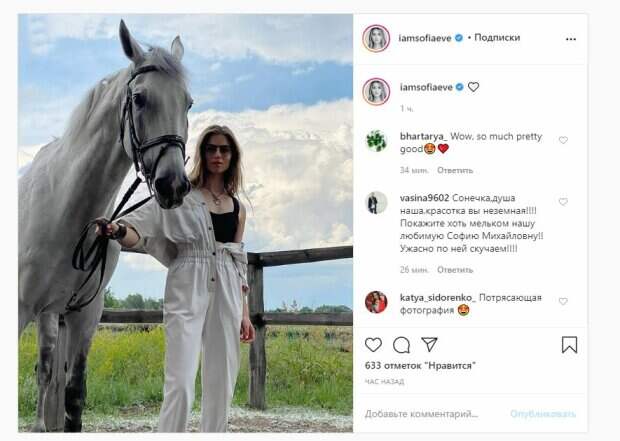Внучка Софии Ротару Соня Евдокименко показала смелый образ, отправившись на прогулку На фото Соня показывает себя в белом комбинезоне, который спустила на одном плече. Как можно заметить, красотка под него надела черный топ, а образ дополнила очками. Евдокименко стояла возле белой лошади и смотрела в камеру, пока ее снимали.