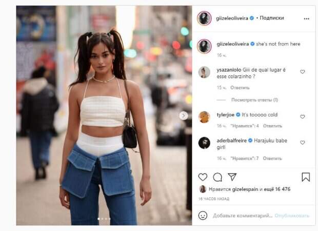 Об этом пишет Politeka.net со ссылкой на страничку знаменитости. "Она не отсюда", - подписала звезда кадры. Фанаты поставили почти 20 тысяч лайков и написали комментарии: "Откуда это ожерелье?", "Слишком холодно", "Ты не с земли ...", "Теперь хочу косички", "боже, я одержим", "У тебя очень милая прическа", "Мэм, это незаконно", "Боже мой, как прекрасно", "Мне очень нравятся твои фотографии в Нью-Йорке", "Красивый эксцентричный стиль", "Люблю весь образ. Это меня взбесит!", "Оформление подиумных улиц", "Если бы у меня еще не было стандартной учетной записи, эта фотография сделала бы меня стандартной учетной записью". Мы писали, что звезда Victoria's Secret, известная модель Жизель Оливейра показала стильный домашний образ. Модель решила побаловать поклонников, засветив плоский животик, и намекнув, что скрывается под бесформенной кофтой. Шелковистые волосы придали образу женственности. Напомним, бразильская красотка из Victoria's Secret в кружевном корсете устроила "пожар" на камеру Также Politeka писала, что бразильская красотка из Victoria’s Secret прижала "персики" узеньким топом А еще Politeka сообщала, что бразильская звезда Victoria's Secret в мини показала райский вид на Гавайях