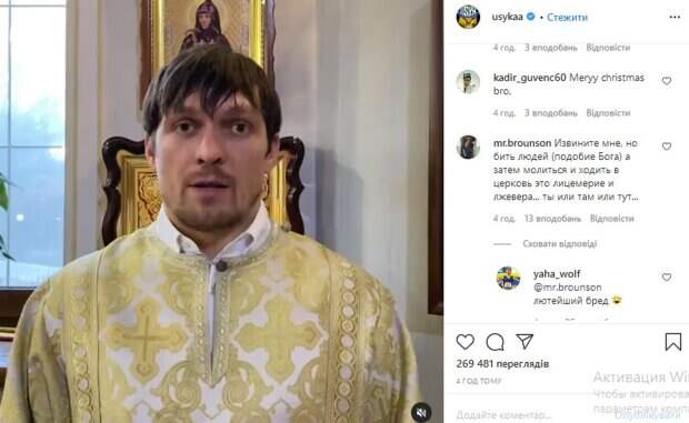 Желаю здоровья, счастья, любви и радости всем-всем-всем», - отметил он. Уточним, что все происходит в церковной рясе, а за спиной Усика можно заметить несколько икон. «Мощно, спасибо!», «Говорит по-русски, а пишет украинским языком, и добавляет английским,просто ужас