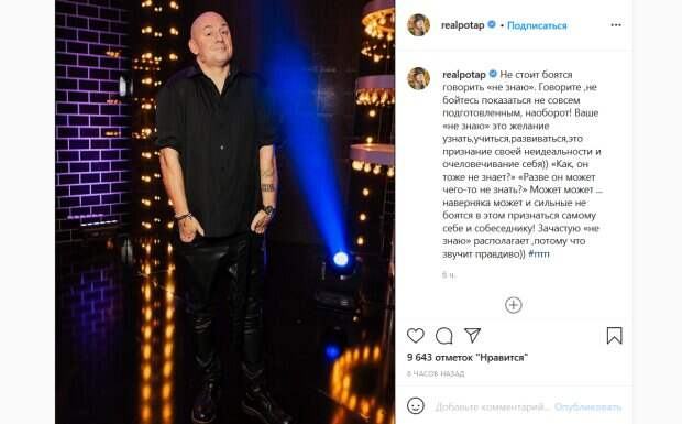 «Не стоит боятся говорить «не знаю». Говорите, не бойтесь показаться не совсем подготовленным, наоборот! Ваше «не знаю» это желание узнать, учиться, развиваться, это признание своей неидеальности и очеловечивание себя», - написал Потап. Он добавил, что сильные люди не должны бояться подобных признаний. «Сильные не боятся в этом признаться самому себе и собеседнику! Зачастую «не знаю» располагает, потому что звучит правдиво», - уверен продюсер. Этот пост он сопроводил собственным снимком. На нем Потап стоит в черной рубашке и черных штанах под кожу. Он засунул руку в карманы и характерно пожимает плечами, будто демонстрируя, что чего-то не знает. Поклонники тут же отреагировали на пост артиста. «Нравится как вы мыслите. Читая, каждый раз вдохновляешься, узнаешь новое и расставляешь свои приоритеты», «Спасибо, что живой», «Я знаю, что ничего не знаю», «Хорошие слова, действительно так и есть», - пишут люди. Напомним, где после свадьбы живут Каменских и Потап, впечатляющие кадры особняка по соседству с Осадчей: "Камин, бассейн и...". Как сообщала Politeka, Потап с оружием в руках похвастался перед украинцами десятью миллионами: "Вы как всегда...". Также Politeka писала, что Каменских рассказала, что происходит у них с Потапом в постели, певица лишилась сна: "Лёшка так. ..".