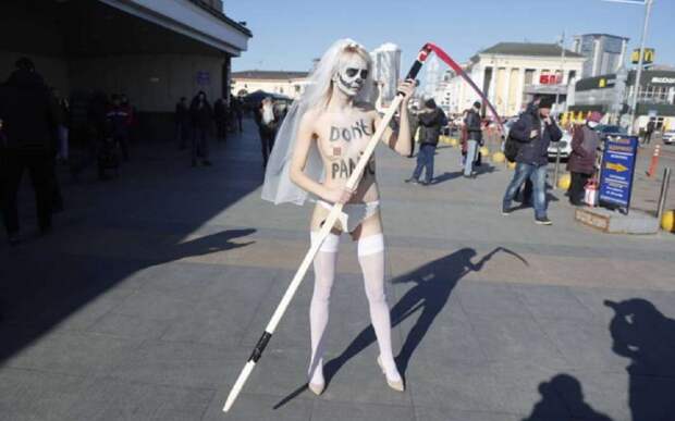 Сегодня, 22 февраля, полуобнаженная активистка Femen, на которой из одежды были лишь чулки, трусики и фата, устроила необычный перфоманс у входа в центральный железнодорожный вокзал Киева, пишет ТСН. В руке у девушки была коса, на ее груди и животе красовалась надпись "Don't Panic", а на спине - "Не верь!