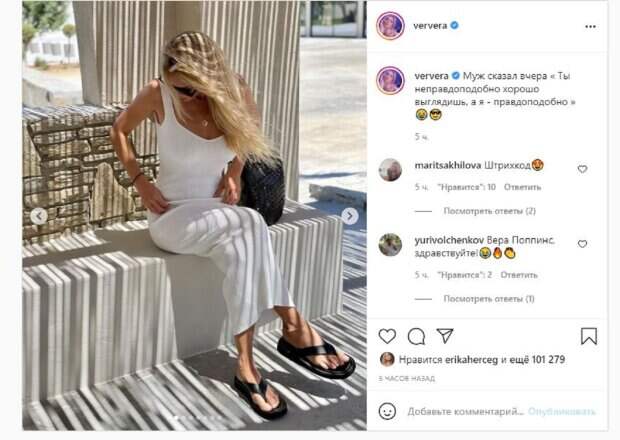 Сейчас певица замужем за Константином Меладзе и воспитывает двоих детей от прошлых отношений. Не забывает Брежнева и об Инстаграм, где делится с фанатами интересными образами. Красотка сейчас на отдыхе и новых фото показалась в стильном длинном платье и тапочках. Девушка опубликовала несколько фото, демонстрируя роскошные формы со всех сторон. "Муж сказал вчера "Ты неправдоподобно хорошо выглядишь, а я - правдоподобно", - написала Вера Брежнева. Фанаты поставили более 100 тысяч лайков и написали комментарии: "Штрихкод", "Вера Поппинс, здравствуйте", "Все-таки в очередной раз убеждаюсь, чтобы выглядеть красиво , достаточно лаконично одеться, но ОБЯЗАТЕЛЬНО быть любимой и счастливой", "Когда женщиной восхищаются, ей ничего не остаётся как восхищать!!!". Напомним, Вера Брежнева с подругой в купальниках поразили видом на отдыхе А еще Politeka писала, что Брежнева вышла на прогулку в узком топе, заворожив красотой Также Politeka сообщала, что смущенная Вера Брежнева поразила видом возле бассейна