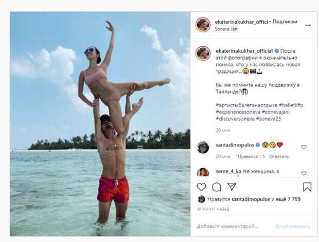 Красотка улыбалась, а глаза прикрыла глазами. Об этом пишет Politeka.net со ссылкой на страничку знаменитости. "После этой фотографии я окончательно поняла, что у нас появилась новая традиция...", - написала звезда под фото. Фанаты поставили почти 8 тысяч лайков и написали комментарии: "Не женщина, а мечта", "Шикарная традиция", "Клево", "Ну вы даёте))) балетные до мозга костей", "Отдых, репетициям не помеха. А вообще, очень грациозно и красиво", "Супер красиво!!! Молодцы!!!", "Танцуй везде. Танцуй на суше и в воде", "Отличного и увлекательного отдыха!", "Очень вас любим", "Как Волочкова. Но вас люблю" Мы писали, что украинская балерина, судья шоу "Танці з зірками" Екатерина Кухар поделилась пикантным кадром с отдыха. У себя в Инстаграм красотка опубликовала фото, на котором предстала в весьма непривычном для нее образе. Кухар позировала в зеленом купальнике с черными кружевами. Бикини было больше похоже на нижнее белье и сидело на Екатерине идеально. Напомним, ЧП произошло с Кухар из "Танців з зірками" на Мальдивах, появились детали А еще Politeka писала, что взмокшая Кухар из "Танців з зірками" ошеломила экстримальными забавами с мужем Также Politeka сообщала, что Кухар из «Танців з зірками» променяла балетную пачку на бикини, засветив аппетитные формы