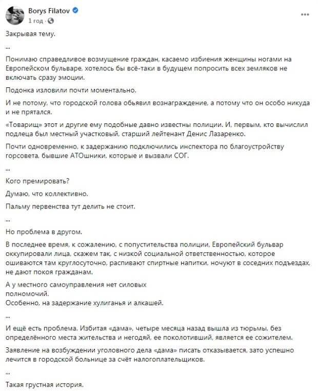 По его словам, заявление на возбуждение уголовного дела женщина писать отказывается, "зато успешно лечится в городской больнице за счет налогоплательщиков". "Такая печальная история", - резюмировал мэр Днепра. Он также отметил, что в последнее время Европейский бульвар "оккупировали" лица "с низкой социальной ответственностью", которые находятся там круглосуточно, распивают спиртные напитки, ночуют в соседних подъездах и не дают покоя гражданам. "А у местного самоуправления нет силовых полномочий. Особенно, на задержание хулиганов и алкашей", - отметил Филатов. По мнению мэра, в городах Украины нельзя будет навести порядок до тех пор, пока местное самоуправление не получит полноценных прав от государства. "Хотя бы чтобы иметь возможность наказывать алкашей и хулиганов и не лечить за свой счет тех, кто не хочет работать", - заявил Филатов. Напомним, история с избиением девушки в центре Днепра получила продолжение, кадры: "Обидчиком оказался...". Также Politeka писала о том, в Днепре оправдывают мужчину, который избил девушку в маршрутке: "Всегда поможет". Ранее Politeka сообщала, что женщина атаковала детей в Днепре, приехала скорая и полиция: "Брызнула в лицо..."