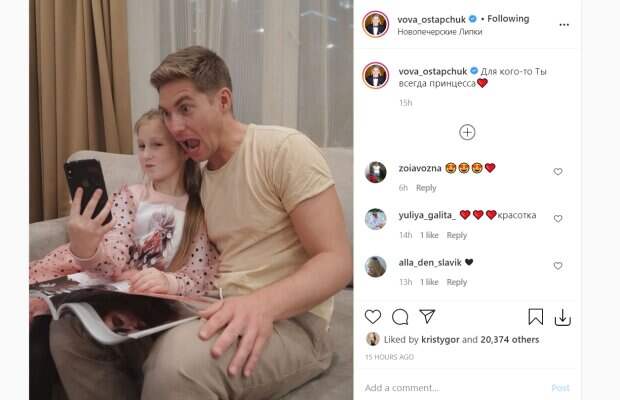 Владимир Остапчук выложил фото с семилетней дочерью, с которой расположился на диване в квартире. Девочка в розовом платье с ярким принтогм прижалась к папе и решила оторвать его от чтения глянцевого журнала ради селфи. Ведущий исполнил каприз Эмилии и скорчил забавную рожу с широко открытым ртом. "Для кого-то Ты всегда принцесса❤️", - отметил Владимир в описании. Пользователи соцсети высказались о домашних шалостях звезды телевидения в комментариях: "Какие вы красивые"; "Копия мама, доця"; "Хорошо и уютно, когда папа рядом ❤️❤️❤️"; "Хорошо и уютно, когда папа рядом ❤️❤️❤️"; "Приятно, очень вас видеть с детьми. Дети, особенно, радуются, когда им папа уделяет свое время!!"; "И на кого твои дети больше похожи?"; "эмоциональное фото, супер)"; "Для наших родителей мы всегда принцы и принцессы