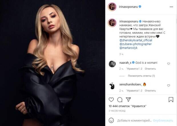 Звезда "Женского квартала" Ирина Сопонару знает, как приковать к себе восхищенные взгляды 34-летняя девушка, как известно, начинала карьеру в качестве фотомодели. Сейчас она является юмористкой "Квартал 95", актрисой шоу «Игры приколов» и входит в состав команды «Винницкие» в «Лиге Смеха». При этом активно ведет свой микроблог в Инстаграм, выставляя кадры не только рабочих будней, но и из личной жизни.