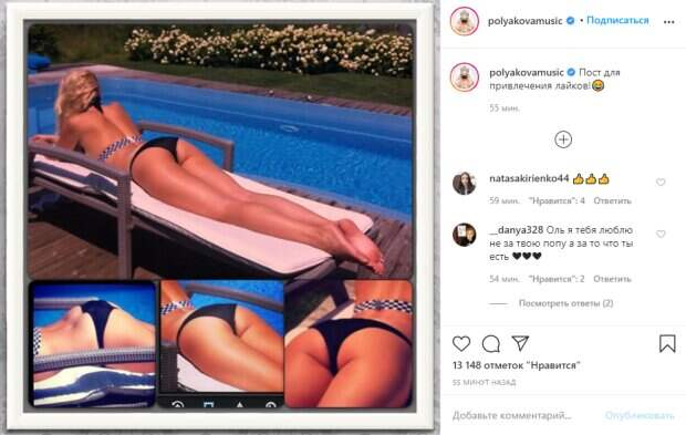 Певица решила похвастаться шикарным видом сзади, лежа на шезлонге. Артистка позволила разглядеть свою пятую точку не только с разных ракурсов, но и вблизи. Можно смело утверждать, что Полякова достигла желаемого результата: кроме почти двадцати тысяч лайков, поклонники оставили под постом певицы сотни восторженных комментариев. "Самая красивая женщина-шоу Украины!", "Так выглядит самая красивая и шикарная женщина в жизни", "Ух, какое давнее фото"! Новое давайте", "Вау. У Вас шикарное тело", - писали поклонники певицы. Ранее мы сообщали, что Оля Полякова устроила с Потапом бурный вечер, обсуждая друзей и говоря о личной жизни. Во время эфира Потап успел забавно подшутить над Олей, а та задала ему пару странных заданий, артисту даже пришлось измазать лицо и голову мокрой землей. Сам Потап рассказал о том, как живет с Каменских, как скрывал свои с ней отношения и как вообще возникла история их любви. Напомним, суперблондинка Полякова показала подросших дочерей Также Politeka писала, что Оля Полякова рассказала, как ее допрашивали прямо на концерте А еще Politeka сообщала, что Полякова и Сумская отбросили скромность и предались безумному веселью на камеру