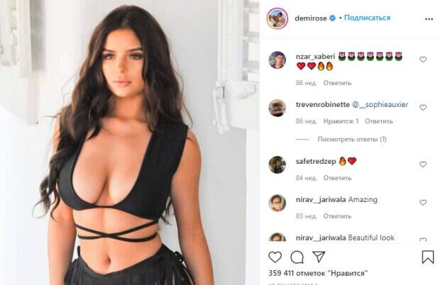 Роуз предпочитает показывать исключительно фото с пляжа и своего отдыха. Как правило, на кадрах молодая знаменитость хвастается пополнением в своей коллекции бикини или удивляет образом во время отдыха в клубе или ресторане. Деми всегда делает акцент именно на пышном бюсте, считая тот своей гордостью, ведь она не делала пластических операций. В черном бикини со шнуровкой под грудью Роуз и правда выглядела весьма соблазнительно, а накидка на бедрах с бахромой идеально дополнила пляжный лук. «Привет, Деми, как дела?; просто роскошная малышка и волшебная девочка