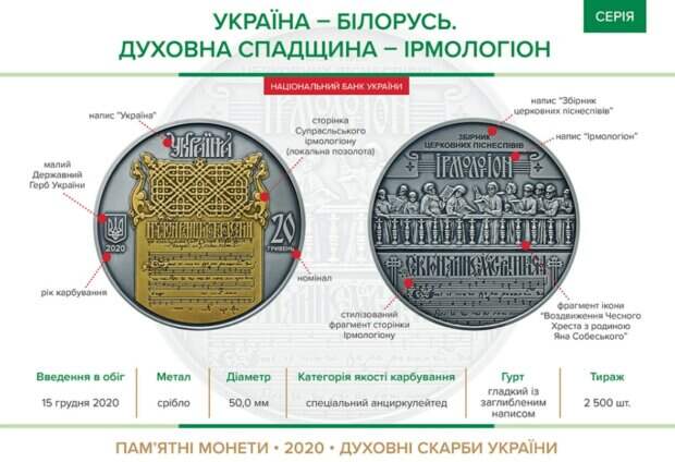 Национальный банк Украины с 15 декабря выпустил в оборот новую монету Серебряная памятная монета "Украина-Беларусь. Духовное наследие – Ирмологион" вышла небольшим тиражом 2,5 тыс. экземпляров, информирует пресс-служба НБУ. Номинал монеты 20 грн, диаметр– 5 см. На аверсе вверху размещена надпись "Украина", под которой изображена позолоченная страница (локальная позолота) Супрасльского Ирмологиона (1598-1601 года) – древнейшей нотолинейной рукописи, источника литургического наследия и музыки Киевской Церкви, которая хранится в Национальной библиотеке имени Вернадского.
