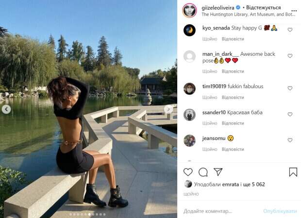 Красотка стояла и сидела, демонстрируя свою невероятную фигурку. На одном из фото она очень удачно выгнулась, показав всю красоту своего тела. «Это место – мечта», - подписала серию снимков модель. За короткое время пост красотки собрал более 5 тысяч лайков. В комментариях ей оставили массу приятных слов. «Очень красиво! Мир всем!», «Такая великолепная», «Какое красивое место», «Топ-модель», «Самая лучшая и красивая девушка», «Я твой фанат», «Какое красивое место! тебе даже не нужно говорить об этом», «Ты выглядишь прекрасно», «великолепная панорама», «Красивая баба», - пишут пользователи сети. Ранее мы писали, что Жизель Оливейра похвасталась идеальным пляжным телом в откровенном купальнике. Красотка порадовала поклонников жаркими фото с пляжа. Она позировала в зеленом купальнике с растительным принтом. Напомним, что Жизель Оливейра посветила прелестями в трикотажном топе. Как сообщала Politeka, что Жизель Оливейра до невозможности задрала экстра-мини, засветив стройную гордость: «Райское наслаждение». Также Politeka писала, что Жизель Оливейра завлекла смелыми позами к себе на кровать, от зоны декольте глаз не отвести: "Женское шоу".