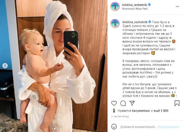 «В перерывах, конечно, сладко спал на улице, но в целом, общался со всеми, фотографировался и что-то рассказывал постоянно - 3- ребенок у нас любит движение и внимание))!», - пишет супруга Решетника. Многодетная мама призналась, что она не из тех, кто держит детей дома до 5 лет. « Мы не из тех родителей, что держим детей дома до 5 лет. Сашуня уже с 3 недель был со мной на съемках, а с месяца был с любимым на мероприятиях
