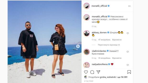 На снимке Ирина Монатик вместе с любимым мужем стоят на берегу моря. Как видно, на прогулку пара вышла в стильном фемили-луке. Пара решила надеть черные шорты и черный верх. Ирина рубашку, а Дмитрий футболку. Волосы женщины растрепаны на ветру, а образ "курортницы" дополняют очки от солнца и милая улыбка. Также Ирина показала знаменитого мужа на стиле В подписи к публикации жена Монатика написала: "Невозможно красиво вокруг... особенно слева от меня