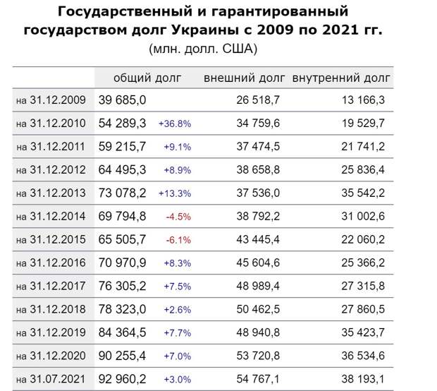 Это связано с валютными и иными колебаниями. В данный момент он составляет 2,49 триллиона гривен. К слову, в 2018 наш государственный долг перевалил за 2 триллиона. То есть, за 3 года прибавилось полтриллиона, или же 500 миллиардов, гривен. Напомним, что государственный долг традиционно принято разделять на внутренний и внешний. Первый – это задолженность государства перед внутренними инвесторами, кредиторами и владельцами ценных бумаг. Второй – это, как понятно из названия, долги перед другими странами, внешними кредиторами и международными организациями. К примеру, МВФ. Так, по данным Министерства финансов, внешний прямой долг у нас вырос. В то же время, внутренний долг несколько снизился. Однако в любом случае, цифры, мягко говоря, далеки от оптимистичных: за 2021 год госдолг Украины в долларах вырос на 3%, а в гривне – почти на 17%. Фактически, это можно считать закономерным итогом работы правительства Шмыгаля. Доля обязательства в долларе в общей структуре украинского госдолга как в долларах, так и в гривне и вовсе возросла на 36% за год. К слову, ранее Минфин понизил прогноз по выплатам госдолга – правда, незначительно, лишь на 0,8 миллиарда гривен. Сентябрь, который начнётся уже завтра, станет пиковым месяцем по выплате долгов – более 100 миллиардов гривен. Фото: Минфин Для понимания: весь ВВП Украины за прошлый год (данных по этому году пока что нет) составил 155 миллиардов долларов. Бюджет Украины в 2020 году составил 45 миллиардов долларов (доходная часть), а расходная – и вовсе более 48 миллиардов. Дефицит бюджета – 3,6 миллиарда долларов. Таким образом, в данный момент госдолг нашей страны это два её бюджета и более 60% от ВВП. Цифры, откровенно говоря, не радуют. Фото: Минфин Отметим, что динамика госдолга постоянно растёт. То есть, должны мы всё больше и больше – несмотря на постоянные пики по выплатам. Мы не можем отдавать взятое, поскольку либо берём новое, либо не успеваем за процентами. Ситуация довольно патовая: к примеру, с 2019 года госдолг возрос на 500 миллиардов, из которых 150 миллиардов – только за время работы правительства Гончарука. Ранее мы писали о госдолге Украины по состоянию на осень 2020 года. Понравился материал? Поставьте ему 5 звезд. Это важно для автора.