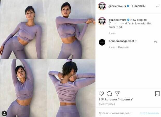 При этом топ, судя по фото, был явно тесный для ее внушительных форм, на что обратили внимание ее поклонники. «Лучшая», «невероятная. Очень круто смотришься», «фигура на миллион. Можно смотреть вечно», «естественная красота – самая лучшая», «роскошная малышка. Обожаю тебя», - пишут они. До этого мы писали, что модель из Victoria’s Secret Жизель Оливейра засветила пикантные места в облегающем топике Красотка постоянно хвастается своей красивой фигурой в Инстаграм, пишет Politeka.net. Так, модель всего несколько минут назад опубликовала новое жаркое фото. Жизель позировала в сиреневом спортивном костюме, обтянувшем ее шикарные формы. Топик с длинными рукавами отлично сел на груди звезды. Ткань обтянула прелести, которые были без белья. Топик внизу сделался "гармошкой" и, подпрыгнув, оголил стройную талию. Напомним, роскошная брюнетка из Victoria’s Secret выставила напоказ самый лакомый кусочек: "этот ракурс не скрывает ничего". Как сообщала Politeka, жгучая брюнетка из Victoria’s Secret подразнила аппетитными булочками в штанах для йоги. Также Politeka писала, что модель Victoria’s Secret без белья нагнулась, едва не засветив свои "ягодки".