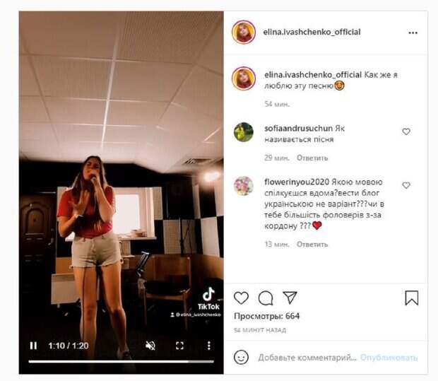 "Как же я люблю эту песню", - написала Элина. На кадрах девушка позировала в футболке, кроссовках и шортиках. Девушка держала в руках микрофон, исполняя популярную песню. Фанаты посмотрели видео сотни раз и написали комментарии: "Как называется песня", "На каком языке ты разговариваешь дома? Вести блог на украинском не вариант? Или у тебя большинство фолловеров из-за границы?", "Огонь". Напомним, юная фаворитка Олега Винника в очень коротком платье решила полюбопытствовать А еще Politeka писала, что любимица Олега Винника озадачила необычным действием, засветив своего "дружка" Также Politeka сообщала, что сын Виктора Павлика решился на неожиданное заявление о юной фаворитке Винника