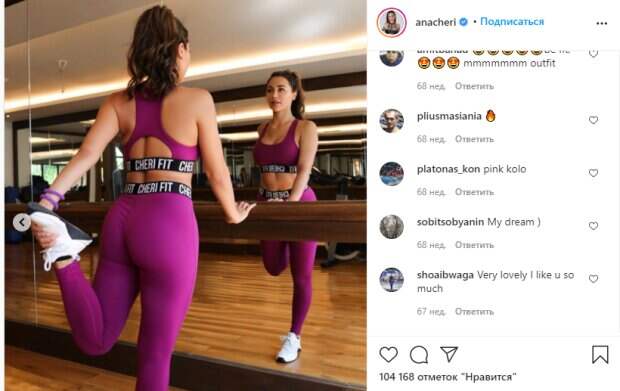 Именно поэтому Чери утверждает, что не страдает от комплексов. Девушка создала собственную линию спортивной одежды, которую показывает довольно часто у себя в профиле. Этот ран не был исключением – Ана примерила фиолетовый костюм, состоящий из лосин и топа: «Посмотри на себя внимательно, ты поддерживаешь себя?? Не позволяйте себе стоять на пути к вашим целям. Не позволяйте своему разуму говорить себе негативные мысли. В следующий раз, когда поймаешь себя на мысли: я не могу этого сделать, это слишком сложно, это невозможно ... Я хочу, чтобы вы остановились !! Я хочу, чтобы вы подумали: Я МОГУ сделать это, даже если не смогу сделать это сегодня, я буду много работать и скоро смогу это сделать, это определенно сложно, но я понимаю, что это возможно! Позитивный настрой - одна из самых важных вещей, которая поможет вам достичь ваших целей!», - подчеркивает Ана. Вот как реагируют в сети: «Быть в форме очень круто