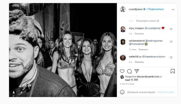 Красотки улыбались и обнимали друг друга. Рядом с девушками был и популярный певец Уикнд, который стоял ближе всех. Об этом пишет Politeka.net со ссылкой на страничку фотографа Рассела Джеймса. "В последний раз, когда я видел Уиикнда кулисами, у него было несколько серьезных резервных копий. Поздравляю с потрясающим шоу в перерыве между таймами на суперкубке", - написал Джеймс под фото. "Люблю это фото", - написала Амбросио. Фанаты поставили более 13 тысяч лайков и написали комментарии: "Ох, Селена Гомес", "Истории, которые может рассказать твоя камера", "живая легенда", "Какое прикольное фото !!", "мечта абсолютного мужчины", "За каждым успешным мужчиной ... есть женщина или ангелы". Сообщалось, что бразильская модель Алессандра Амбросио, представляющая бренд нижнего белья Victoria’s Secret, померялась формами с подружками. Стройная Амбросио в очередной раз доказала свое превосходство, изумив безупречной фигурой. Модель была в коротком топе с рукавами-воланами и "вкусным" декольте, а также длинной юбке с рюшами и соблазнительным разрезом сбоку. Напомним, красотка из Victoria’s Secret восхитила румяными "персиками" в купальнике А еще Politeka писала, что красотка из Victoria’s Secret в бикини устроила нежные шалости с подружками на пляже Также Politeka сообщала, что красотка из Victoria’s Secret в мини-бикини предалась искушению на пляже