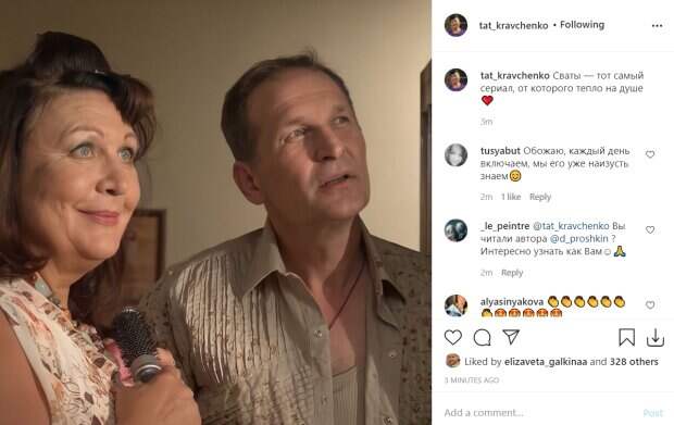 В тот момент Валентина Петровна расчесывала волосы, но с влюбленным взглядом засмотрелась на что-то за кадром. Федор Добронравов в роли Ивана Степановича надел серую рубашку с вычурными полосками и узорами, однако не успел застегнуть ее на кнопки - так и застыл с открытым ртом рядом с сериальной женой. Пара смотрится очень органично и по-домашнему уютно. Пользователи соцсети оставили много комментариев о достоинствах сериала "Сваты" и его актеров: "Сваты — тот самый сериал, от которого тепло на душе ❤️"; "Обожаю, каждый день включаем, мы его уже наизусть знаем
