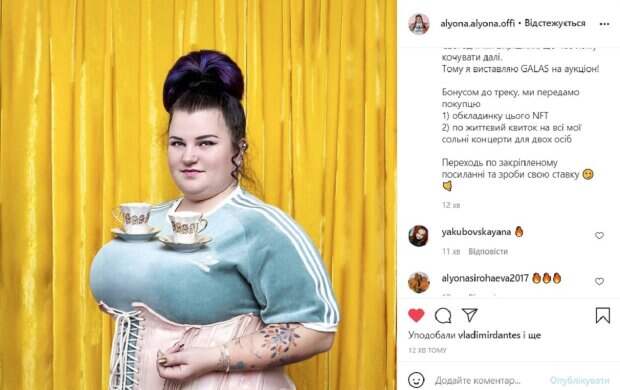 Таким образом Alyona Alyona пытается обратить внимание на треки своего нового альбома Galas. В этот раз Alyona Alyona решила "продать" свой трек, который она записала с канадским исполнителем: "Мы с канадским рэпером Dax записали особый трек и подняли им галас - хайп по-украински. Сегодня мы решили, что пора ему кочевать дальше. Поэтому я выставляю GALAS на аукцион!", - написала рэпер и сообщила условия аукциона. Бонусами к треку Alyona Alyona предлагает обложку этого NFT и пожизненный билет на все сольные концерты Alyona Alyona для двух человек. Поклонники оценили фото певицы, и написали множество комплиментов певице. "Вау!Фото просто треш, у класному сенсі❤️❤️❤️", "Шикарно