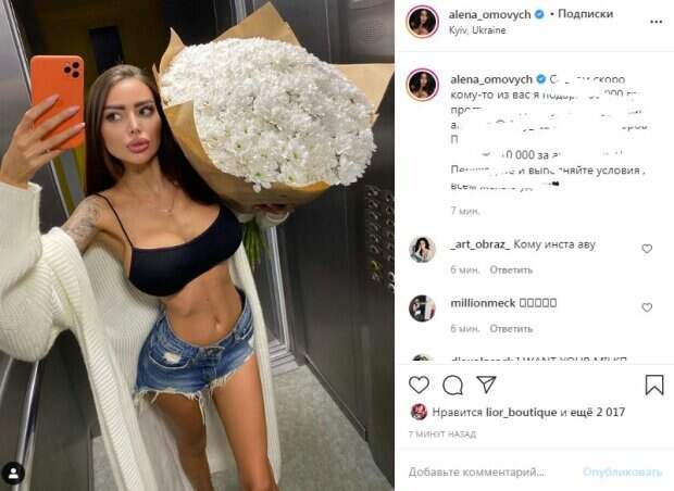 Огромный бюст едва не выпрыгивал из маленькой одежды. Кроме того, по отчетливым признакам было заметно, что модель была без белья. Благодаря длине топика нельзя оторвать взгляда от упругого животика и безупречного пресса модели. Омович, подняла руку вверх, и тем самым также запечатлела стройные ножки и красивые бедра в джинсовых мини-шортах. Примечательно, что модель держала в руках огромный букет цветов. Всего за семь минут пост собрал более 2000 лайков и много комментариев. "Идеальная фигура