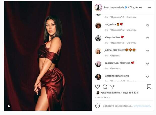 Кортни Кардашьян, известная американская модель, показала себя в новых рубиновых цветах На фото Кортни позировала в юбке и топе. Звезда стояла боком, показывая впечатляющий вырез до бедра. Модель спустила бретельки топа на плечи, а развернулась боком, восхищая роскошными формами. Наряд у девушки был рубинового цвета, что добавило образу особой страсти.