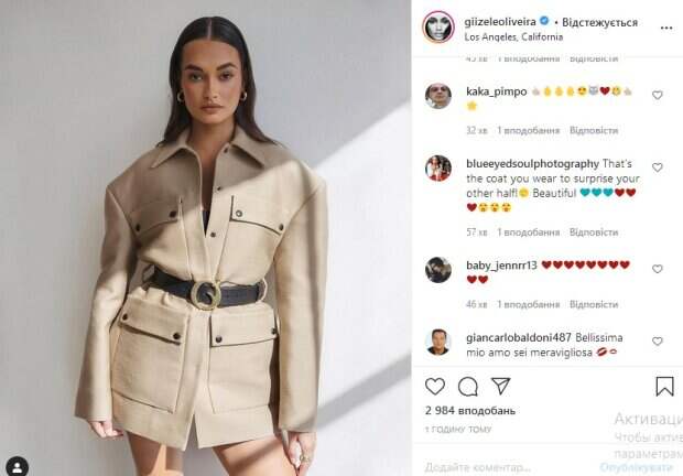 Знаменитость решила дополнить фотографию элегантной прической и практически незаметным макияжем. «Вот это искушение – так распахивать наряд. Просто космос», «вау, ты просто настоящее солнце», «ты очень круто выглядишь», «одно удовольствие наблюдать за тобой», «ты просто сюрприз – удивляешь с каждым снимком», - пишут ее поклонники. Как сообщалось до этого, бразильская модель Жизель Оливейра, звезда бренда нижнего белья Victoria’s Secret, сразила естественной красотой на серии чувственных снимков Знаменитая брюнетка с распущенными волосами позировала в белой рубашке и темных джинсах. Кадр за кадром красотка расстегивала верх, то опуская взгляд, то глядя прямо в камеру - настоящее искушение. Судя по соблазнительным очертаниям под тонкой тканью, девушка не надела бюстгальтера - еще больше вскружив голову своим поклонникам. Напомним, что Жизель Оливейра посветила прелестями в трикотажном топе. Как сообщала Politeka, что Жизель Оливейра до невозможности задрала экстра-мини, засветив стройную гордость: «Райское наслаждение». Также Politeka писала, что Жизель Оливейра завлекла смелыми позами к себе на кровать, от зоны декольте глаз не отвести: "Женское шоу".