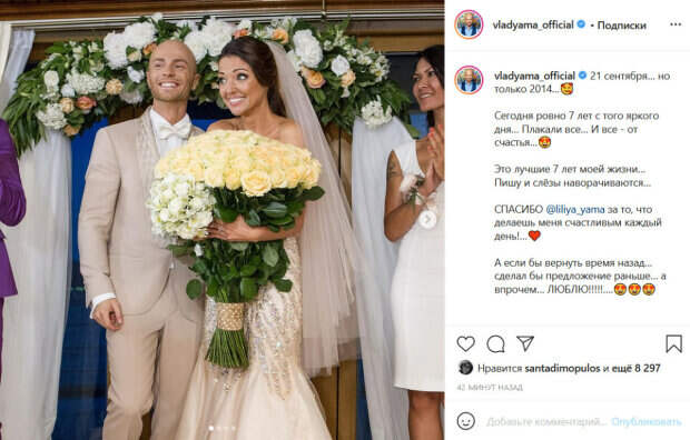 net. Так, Влад вспомнил тот самый день в 2014 году, когда решил связать свою жизнь с Лилией. «Сегодня ровно 7 лет с того яркого дня… Плакали все… И все - от счастья…Это лучшие 7 лет моей жизни… Пишу и слёзы наворачиваются…СПАСИБО Лилия за то, что делаешь меня счастливым каждый день!…А если бы вернуть время назад… сделал бы предложение раньше… а впрочем… ЛЮБЛЮ!!!!!….», - эмоционально написал танцор. В свою очередь, его жена отметила, что ей кажется, будто их свадьба была только вчера. Она также вспомнила, что день их с Владом бракосочетания оказался не таким уж и радужным. «Помню этот день. Этот сильный дождь и бурю (хотя я себе представляла солнечный день), как ты рассёк себе лоб об багажник. Ну вы поняли, день был незабываемым и неповторимым», - поделилась воспоминаниями Лилия. Пара также поделилась фото с праздника. На них можно увидеть, что Влад и Лилия выбрали себе костюм и платье в бежевых тонах. Кроме того, в какой-то момент Лилия переоделась из свадебного наряда в танцевальный, чтобы исполнить танец с супругом. Напомним, Чмерковский и Яма решили выяснить, кто из них круче в прямом эфире. Как сообщала Politeka, жена Влада Яма из "Танців з зірками" возмутила видом на серьезном мероприятии. Также Politeka писала, что жена Влада Ямы из "Танців з зірками" похвасталась идеальными отношениями с мужем спустя 14 лет знакомства.